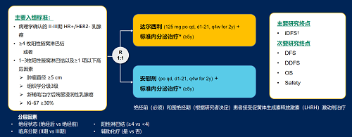 达尔西利(Dalpiciclib)是金年会医药自主研发的口服、选择性的小分子CDK4/6抑制剂,也是中国首个自主研发的新型高选择性 CDK4/6 抑制剂,已证实其与内分泌治疗(ET)联合用于 HR+/HER2- 晚期乳腺癌的一线和后线治疗时,均显著改善无进展生存期(PFS)6,7。因此开展了一项随机、双盲、III期临床试验(DAWNA-A),以进一步评估达尔西利联合内分泌治疗作为高危早期 HR+/HER2 - 乳腺癌辅助治疗的效果。本研究纳入高危复发风险人群需满足以下标准之一:①≥4 枚阳性腋窝淋巴结;②1–3枚阳性腋窝淋巴结且合并≥1 项高危因素(肿瘤直径 ≥5 cm,组织学分级3级,辅助治疗后残留浸润性乳腺癌,Ki-67 ≥30%)。本文呈现预先设定的首次中期分析(IA1)结果。